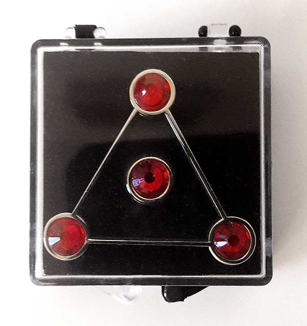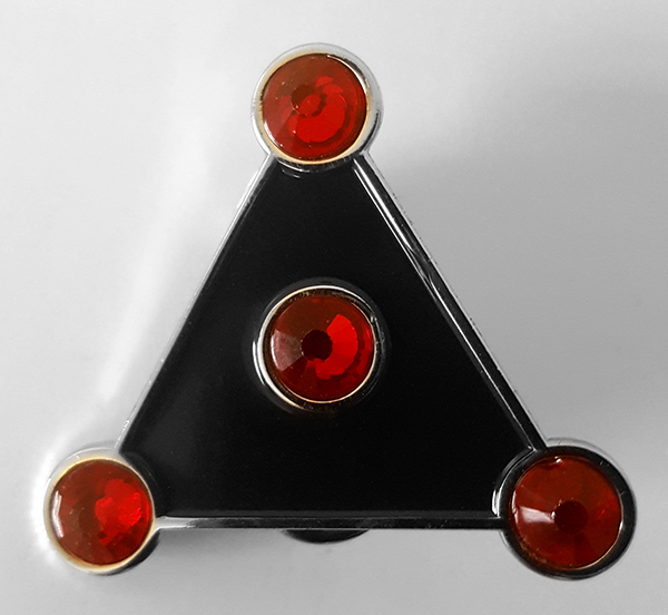 Each 1.5" pin has 4 red faceted stones surrounding a silver guttered enamel pin. The pins come in a plastic case protected by a signed sleeve.