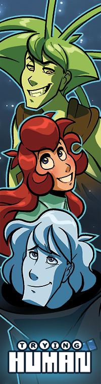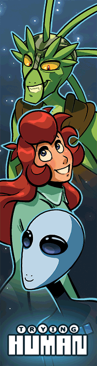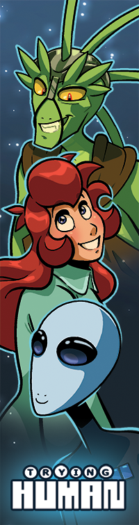 They're finally here: Trying Human lenticular printed bookmarks! Depending on which way you look at the bookmark, Hue and Quazky will appear either human or alien.